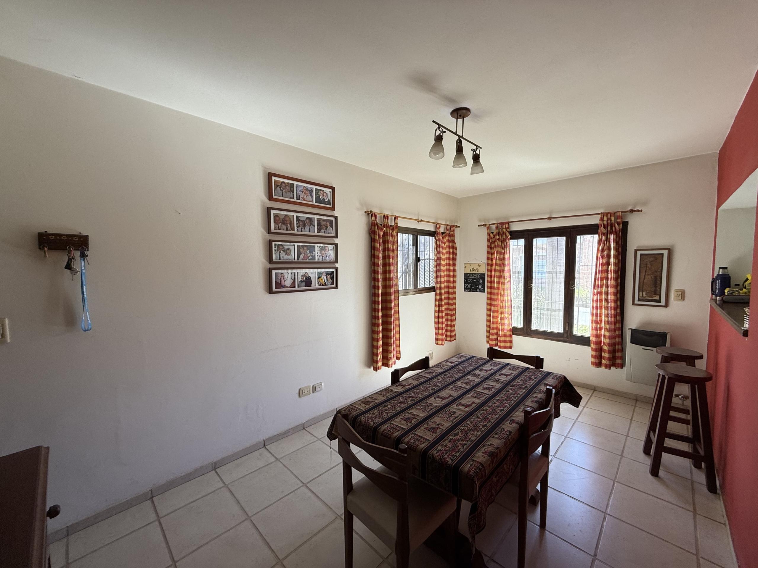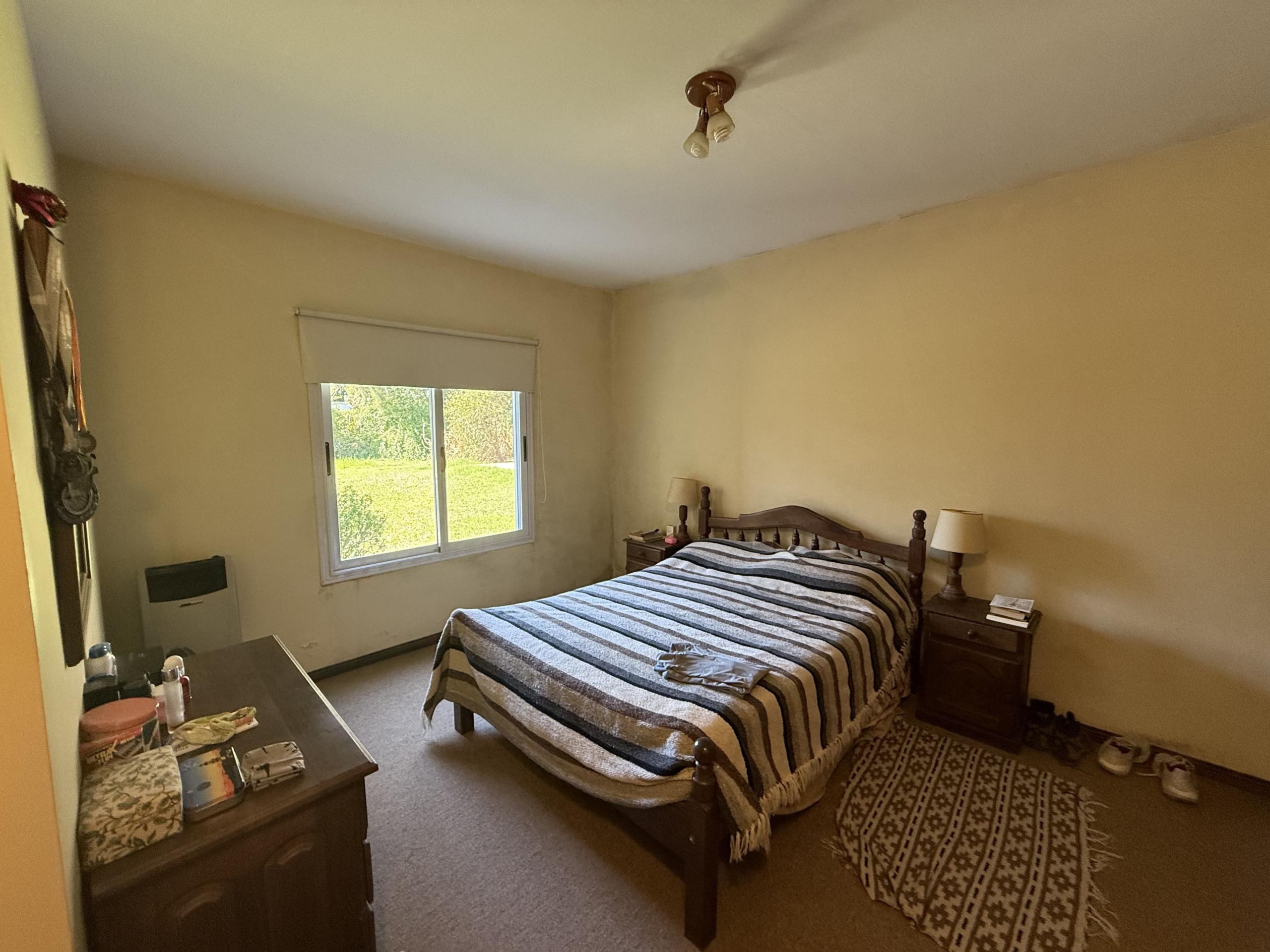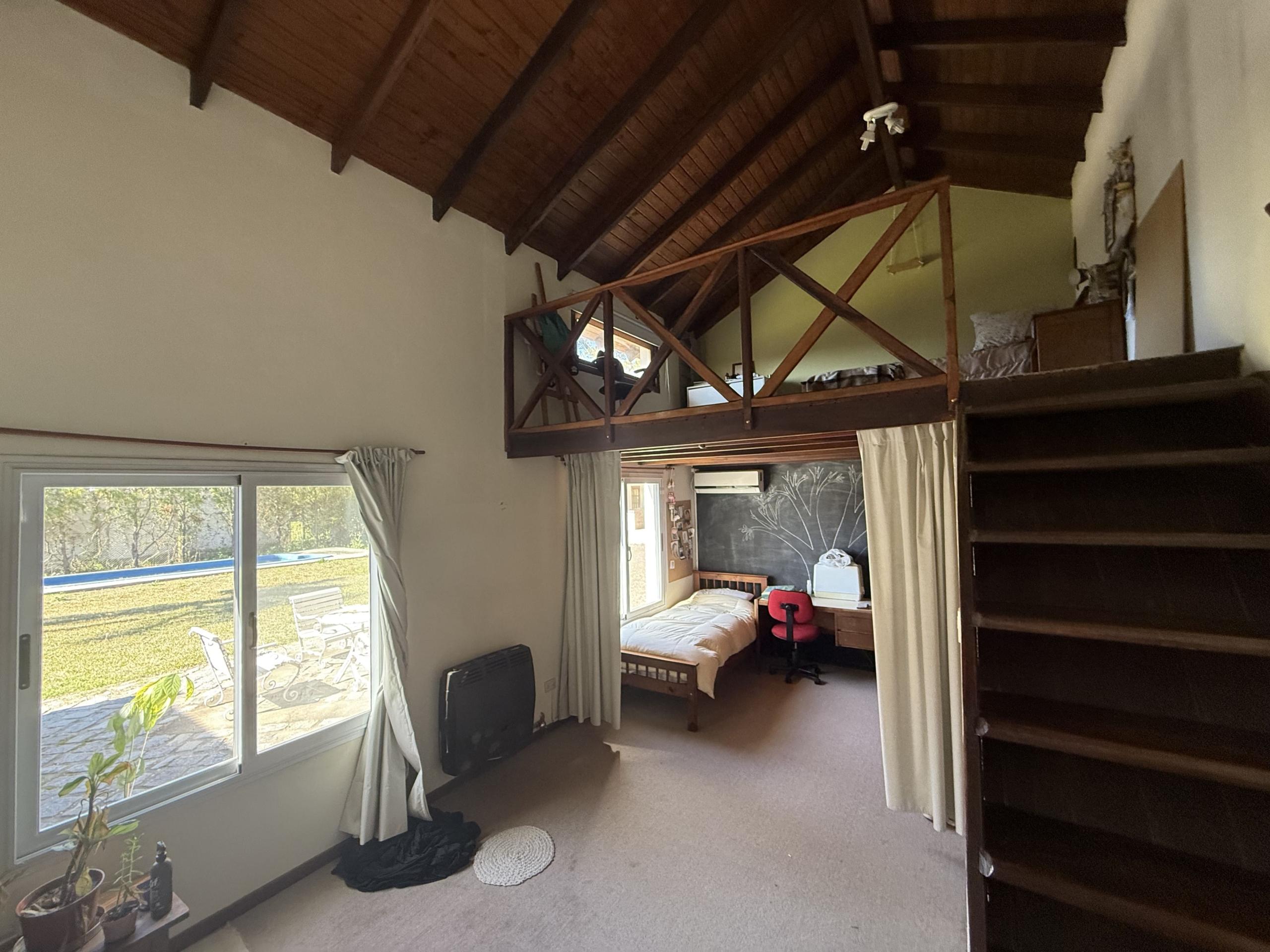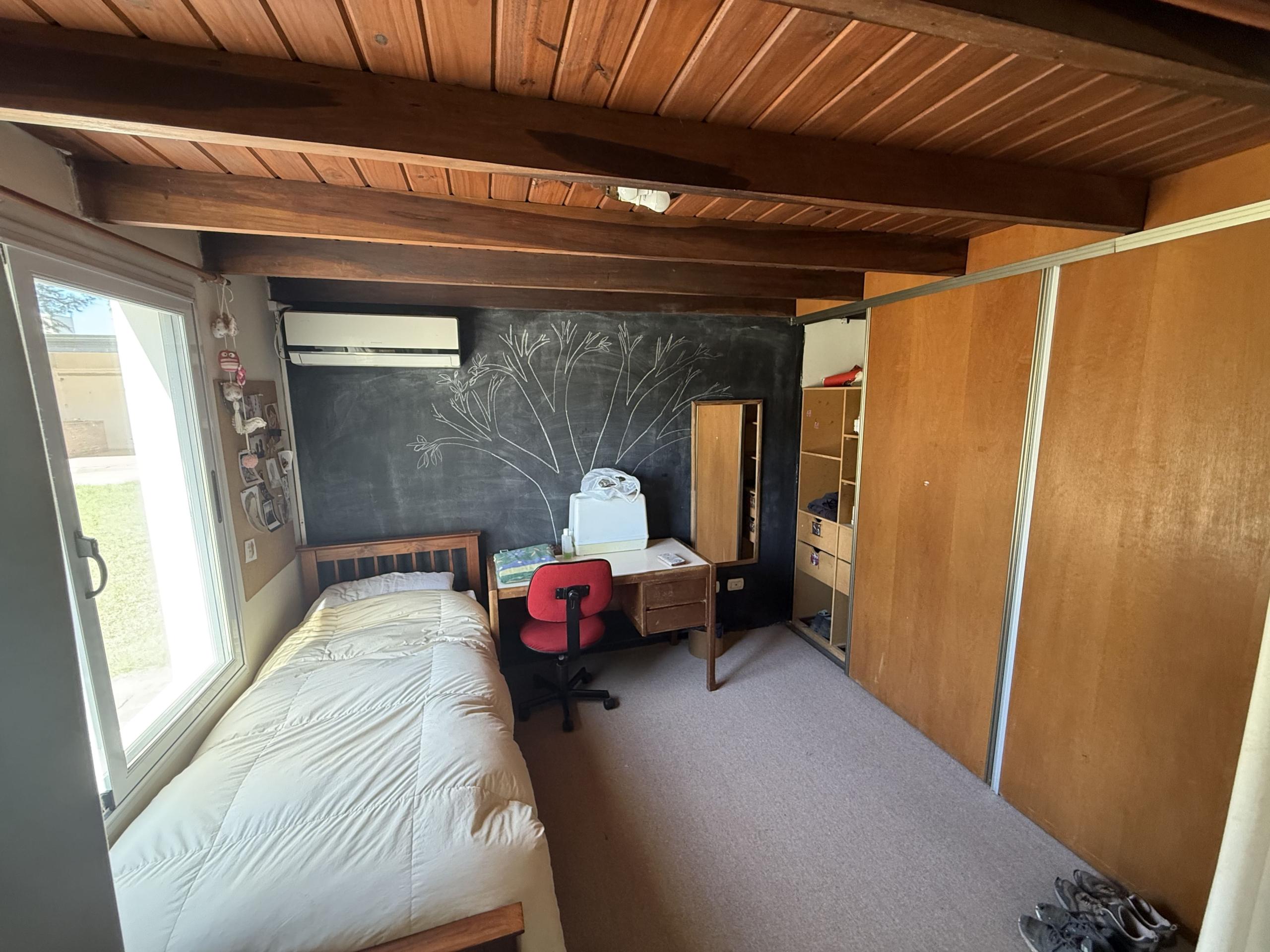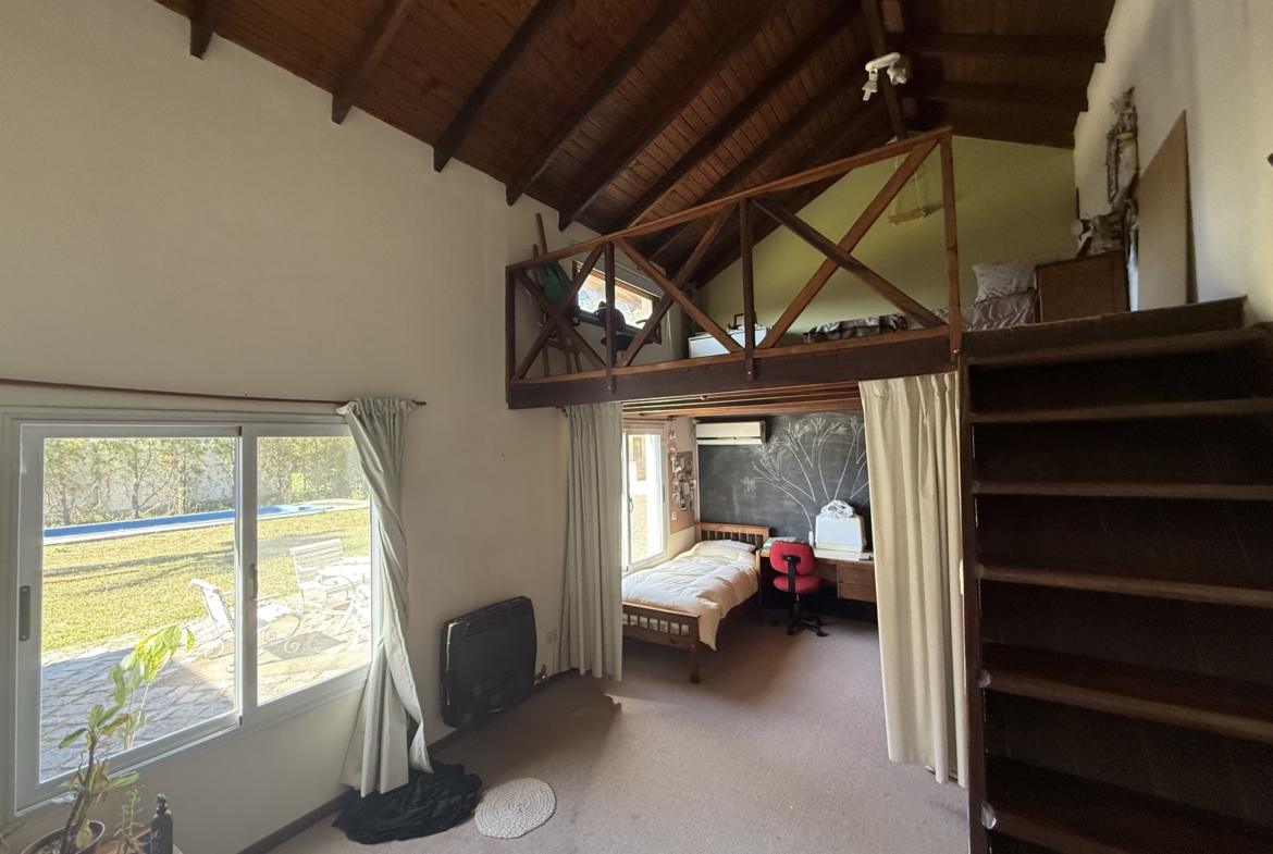 Compuesta por amplio living, cocina, comedor, baño completo, habitación en planta baja y segunda habitación tipo altillo en planta alta con baulera y armario, espacio para oficina, dormitorio principal con baño completo en suite, amplio patio con cesped, piscina, quincho semicubierto con parrilla y garage para dos vehículos.