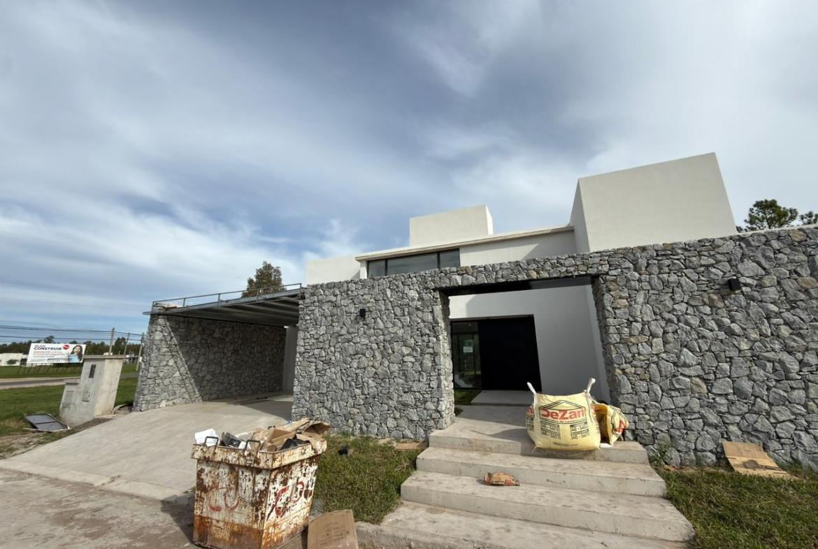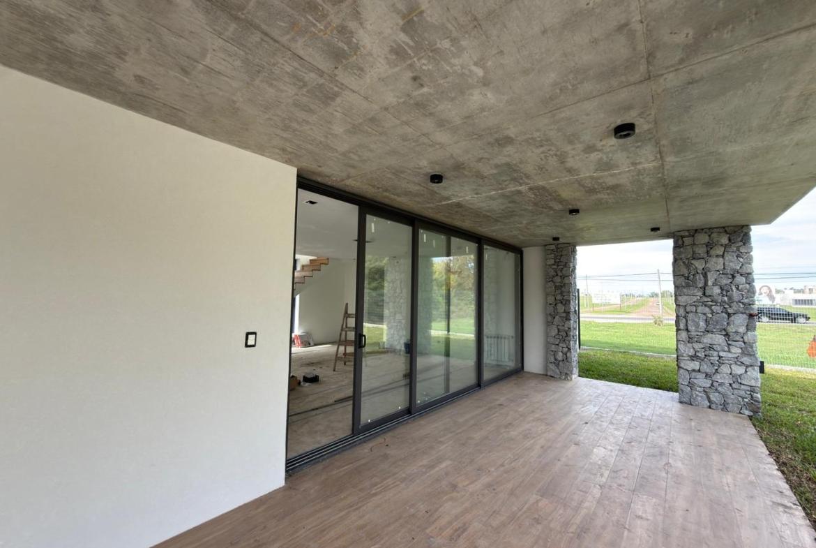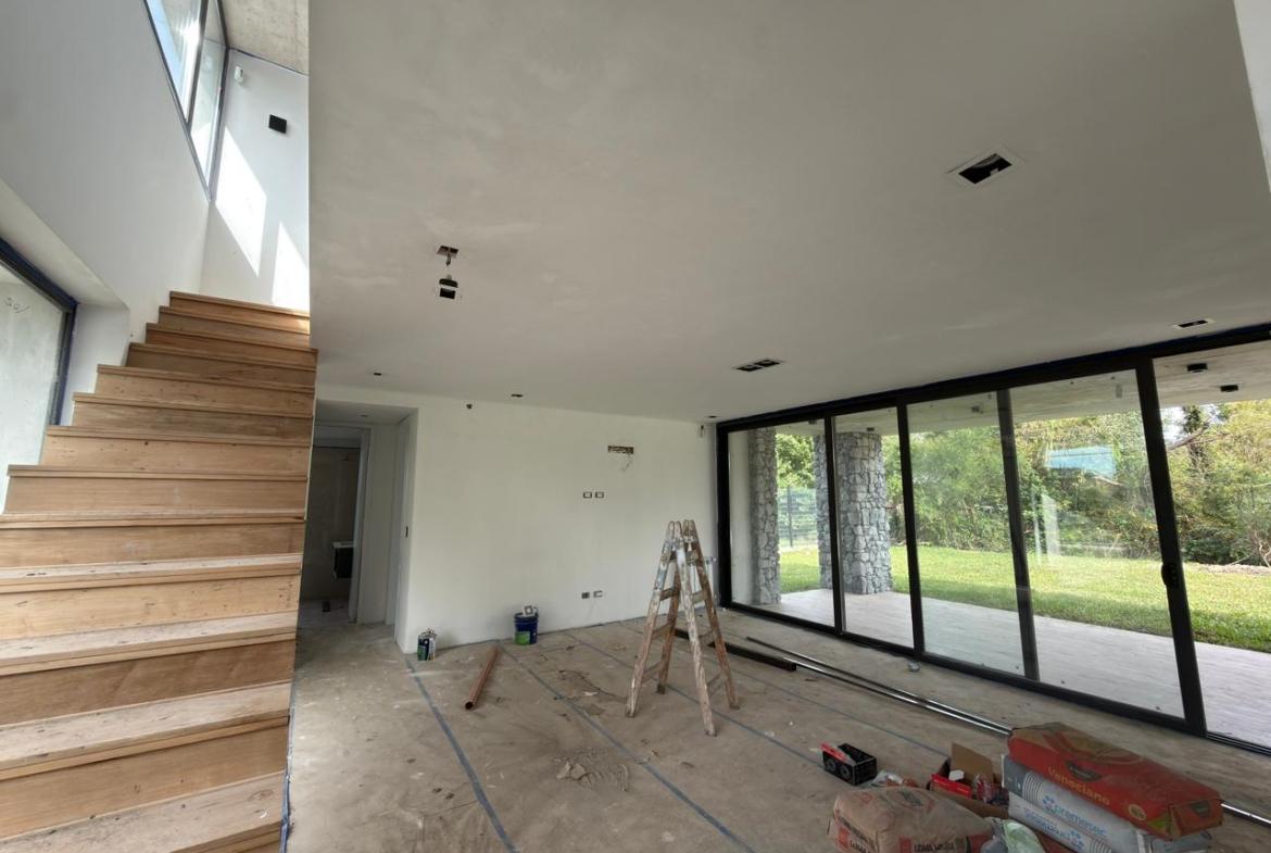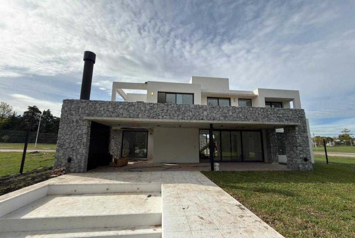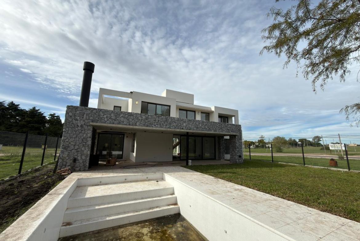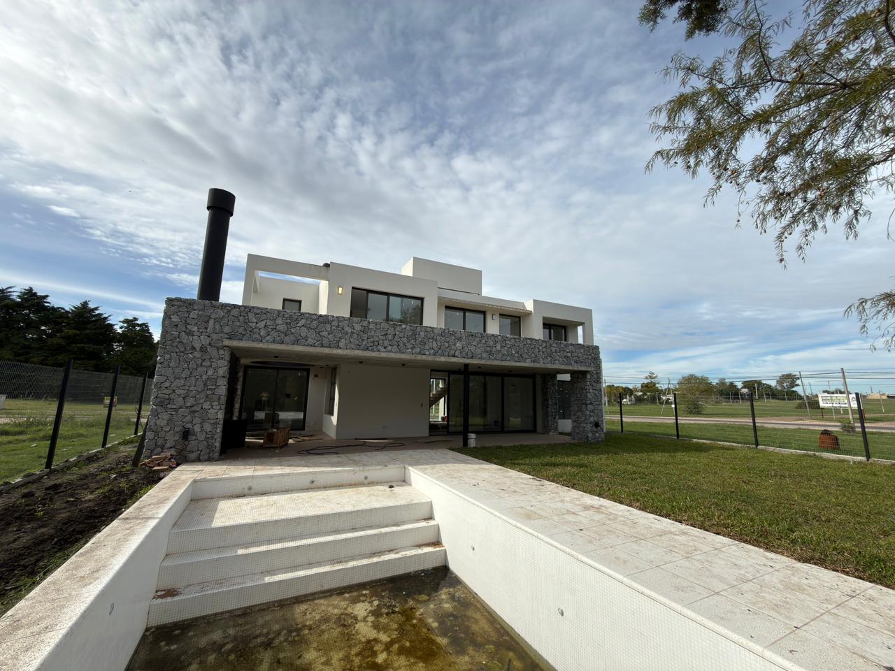 En planta baja: garage semicubierto, living comedor, cocina con isla, lavadero, patio interno, jardín amplio con piscina, galería semicubierta, parrilla, baño completo y habitación luminosa / Play room.