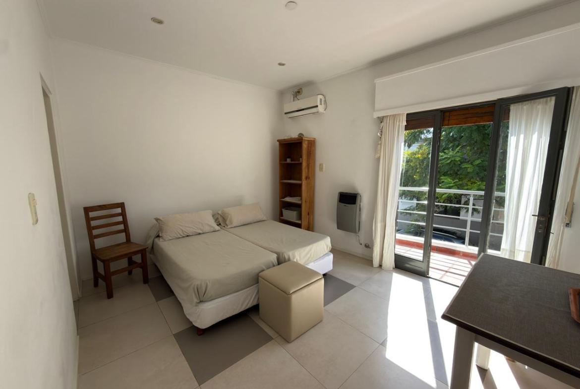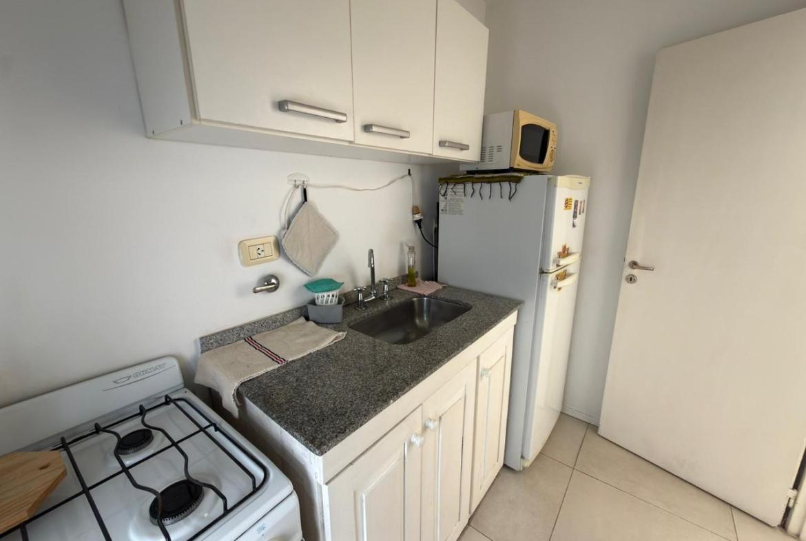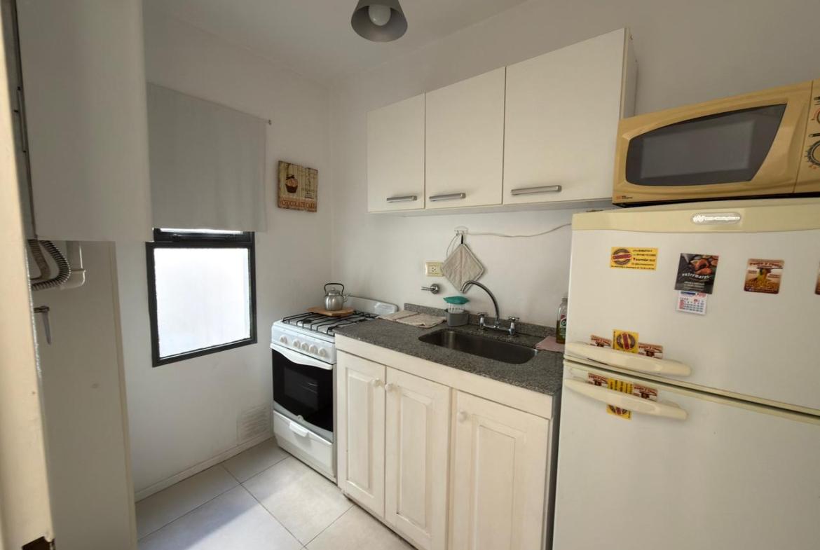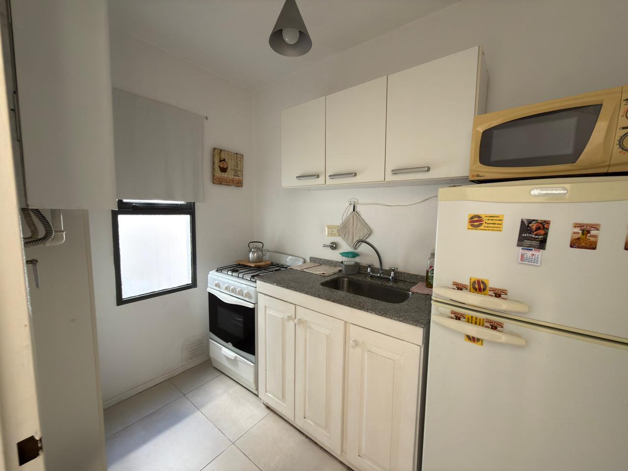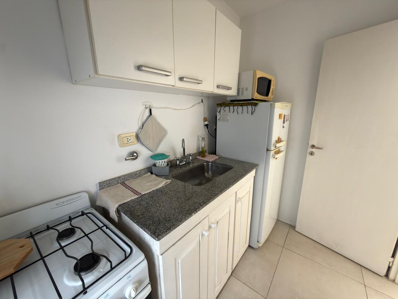 El departamento cuenta con una habitación, cocina, baño completo, patio y balcón.